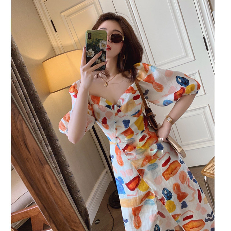 夏季北欧复古高端油画印花泡泡袖连衣萨质设计感法式甜美长裙子热门设计联盟服务商