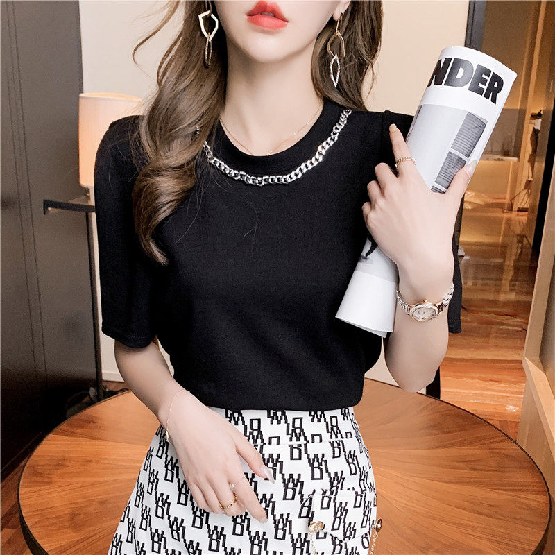 2021新款个性设计链条圆领泡泡短袖宽松百搭纯棉T恤女上衣热门设计联盟服务商